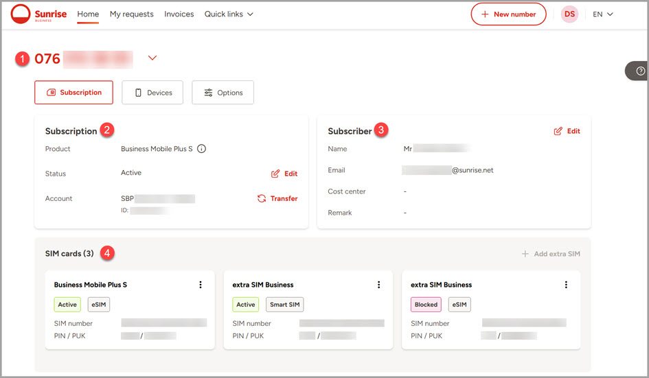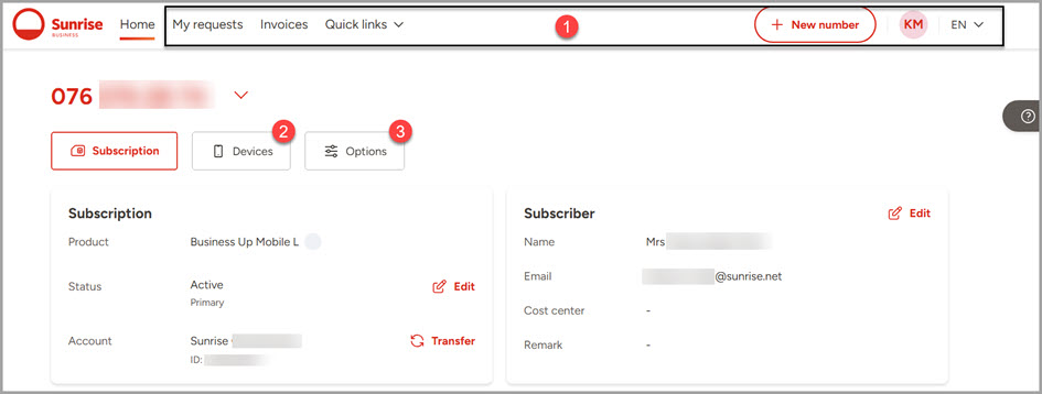 The main subscription page is loaded automatically when you log in to the Sunrise Business Cockpit. It brings all information related to the currently selected mobile number in one place and allows you to manage it according to the policies defined by your company.