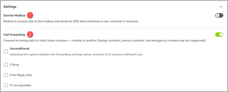 For each scenario, you can forward calls either to your «Sunrise Mailbox» or to another valid Swiss mobile or landline number. Premium-rate and short numbers are not allowed.