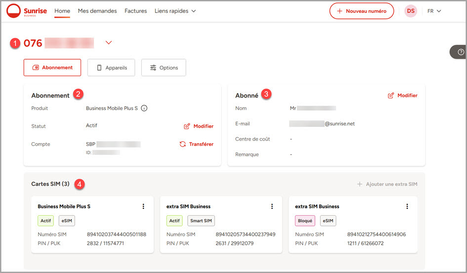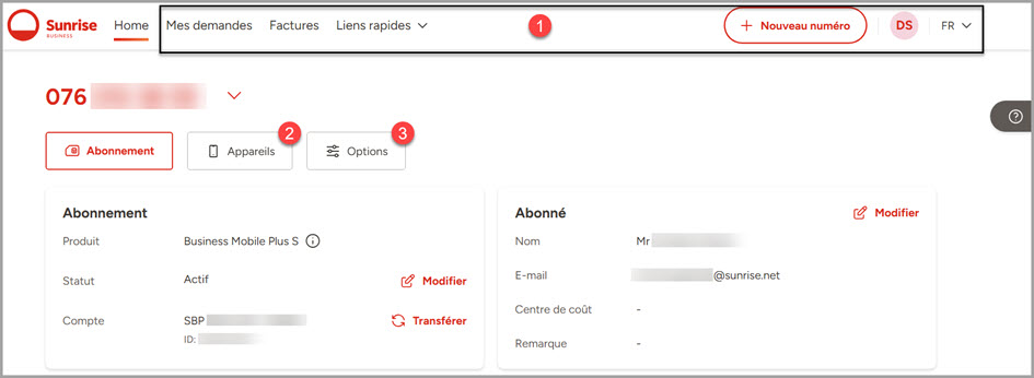 La page d'abonnement principale est chargée automatiquement lorsque vous vous connectez au Sunrise Business Cockpit. Elle regroupe toutes les informations relatives au numéro de mobile actuellement sélectionné en un seul endroit et vous permet de le gérer conformément aux politiques définies par votre entreprise.
