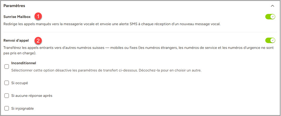 Pour chaque scénario, les appels peuvent être redirigés vers la « Sunrise Mailbox » ou vers un autre numéro mobile ou fixe suisse valide. Les numéros surtaxés et les numéros courts ne sont pas autorisés.