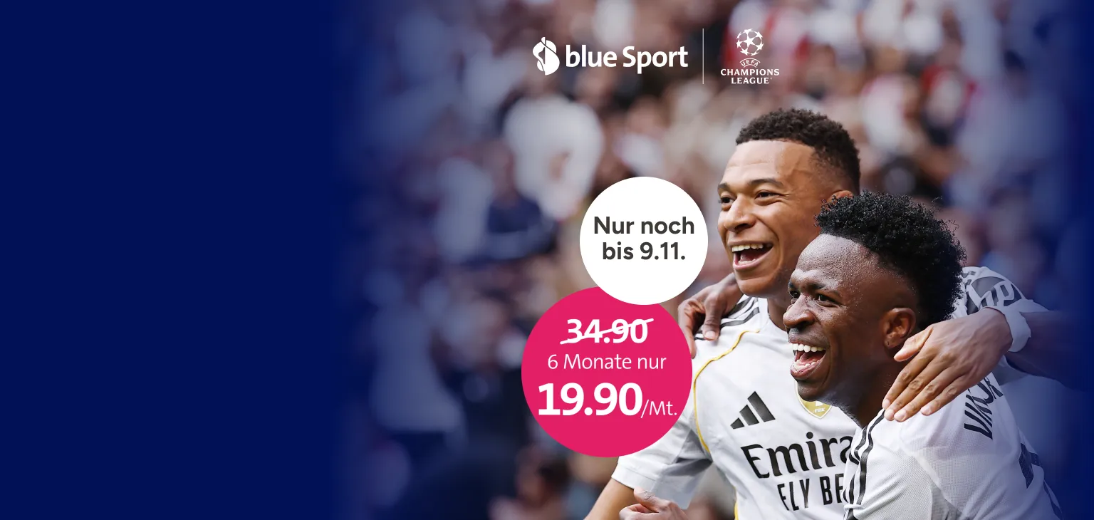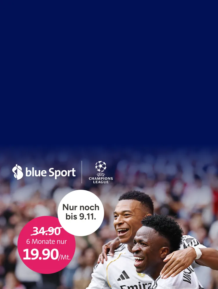 *Angebot gilt für blue Sport Jahresabo Neukunden bis 09.11.25. Das Abo kostet ab dem Aktivierungsdatum für 6 Monate 19.90/Mt. Anschliessend wird der reguläre Preis (34.90/Mt.) in Rechnung gestellt. Das Abo ist unter Einhaltung einer Frist von 1 Monat erstmals auf das Ende der 12-monatigen Mindestvertragsdauer kündbar. Danach beträgt die Kündigungsfrist 1 Monat. Abrechnung über die Sunrise Rechnung.