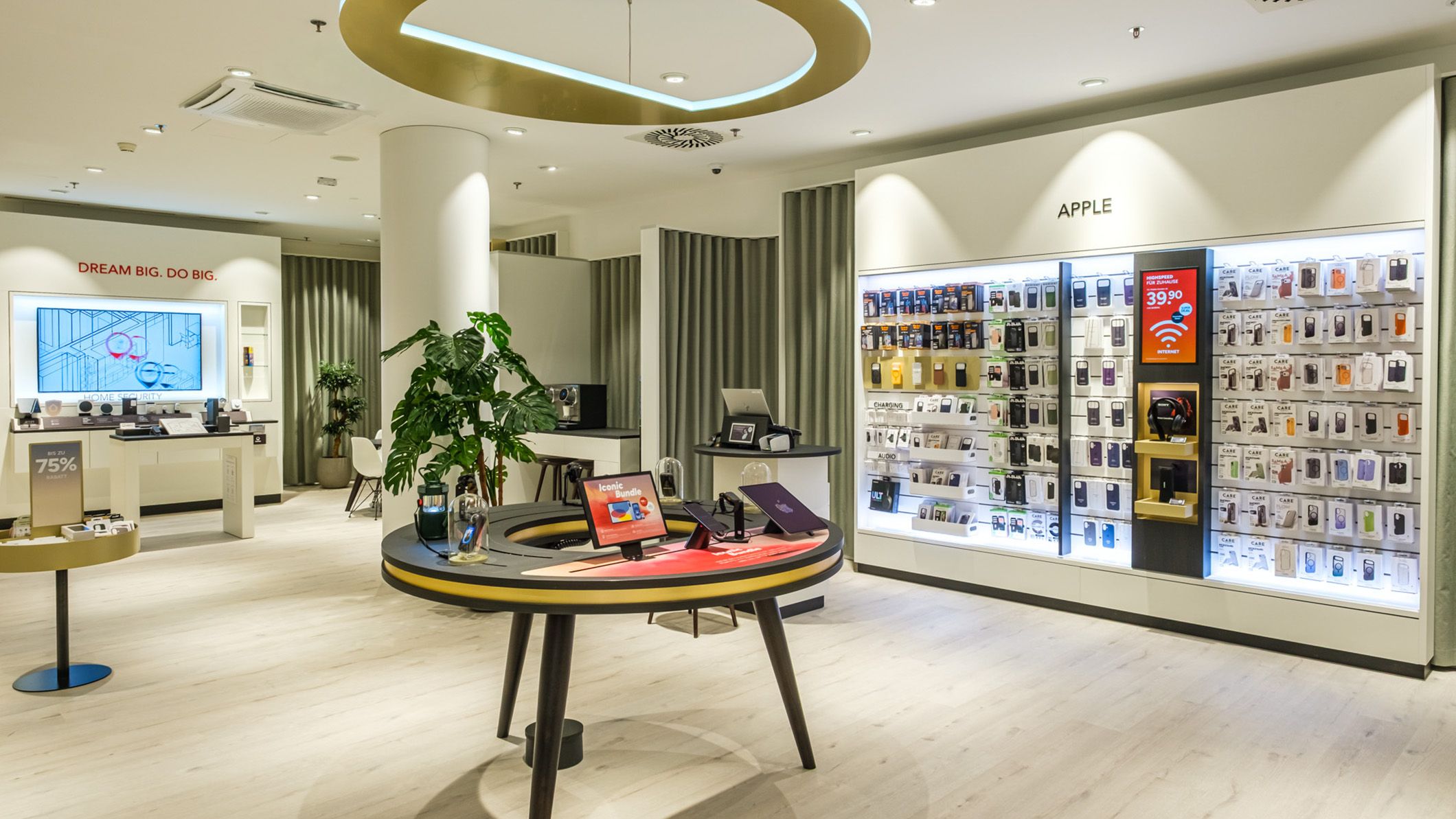 What’s striking is that we now have more subtle colours, more gold and less Sunrise red. Having said that, you’ll now find our logo in other, unexpected places: as a desk and as an Aurora-shaped ceiling lamp, for example. We’re using high-quality materials that create a great vibe in the shop. What’s more, we now also have consultation corners, where you can sit down and discuss your concerns over an espresso with agents, or where you can wait for your friend who’s checking out the latest iPhones on the special Apple wall. The product range has also been expanded and the layout is more logical. Accessories, devices, home security – everything has its place, is clearly separated and easy to find. Apple devices are on the right, Samsung on the left. No more searching. You’ll find what you’re looking for straight away.