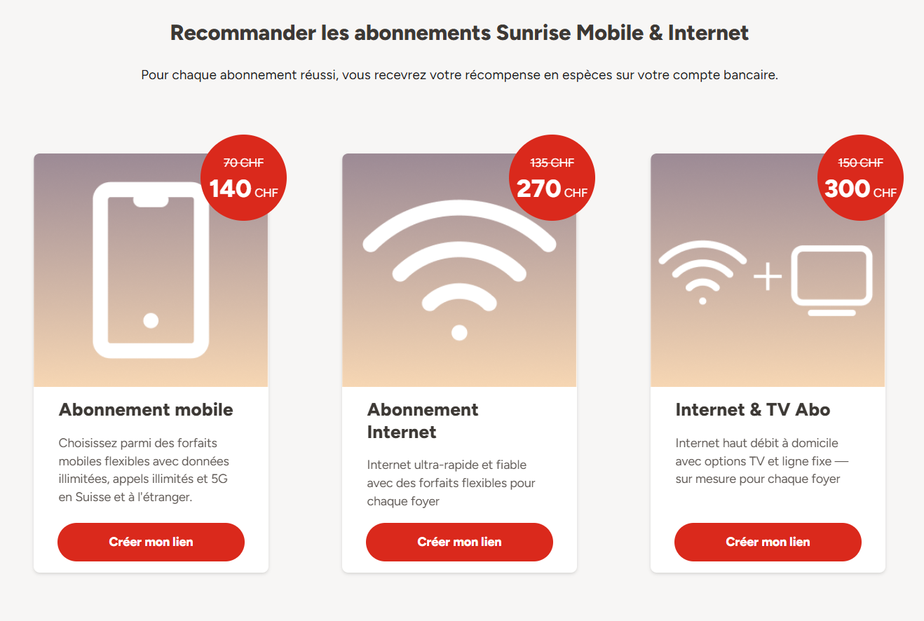 Lorsque vos proches ou votre famille cliquent sur le lien, ils/elles ont la possibilité de sélectionner le produit Sunrise qui les intéresse. Ils peuvent ensuite finaliser leur achat directement en ligne, se rendre dans un Sunrise Shop munis de leur code personnel, ou commander leur nouveau produit par téléphone. Une fois la commande validée et le produit activé, la prime est créditée et devient disponible pour le paiement. Le montant de la prime varie en fonction du produit souscrit: abonnement mobile, Internet ou TV.